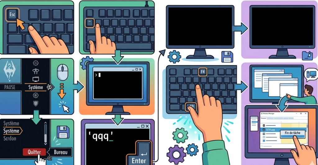 La commande console offre une sortie ultra-rapide quand le menu classique pose problème. On ouvre la console en appuyant sur la touche ~ (le tilde, souvent située à gauche du 1). On tape ensuite la commande et on valide. Le jeu se ferme immédiatement sans passer par aucun menu. Cette option reste valide en 2026 sur toutes les versions PC.
